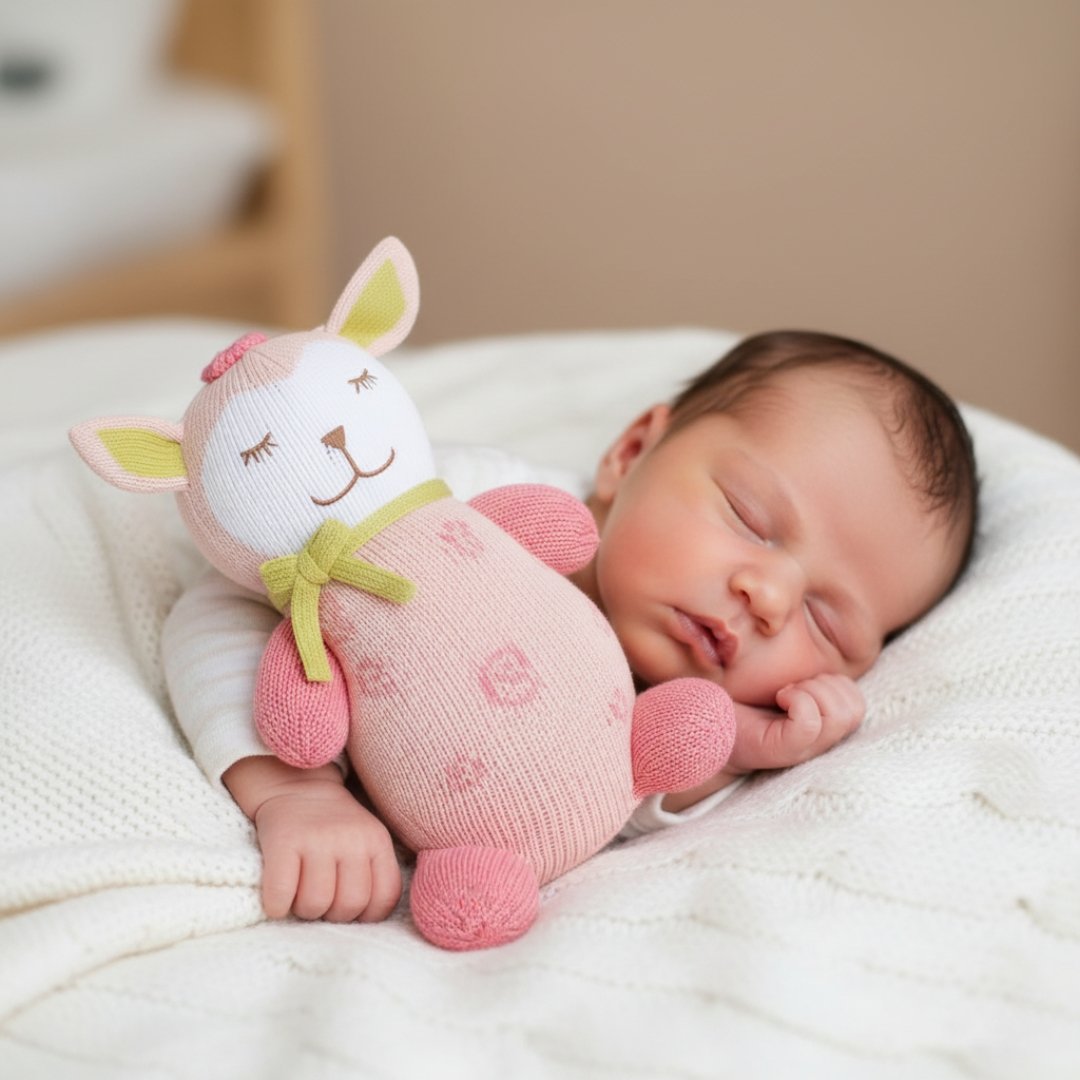 The toy’s gentle embroidered facial features — closed eyes, a sweet smile, and soft ears — make it safe and baby-friendly, with no small detachable parts. Its round, cuddly shape and soft texture make it ideal for hugging, comforting, or decorating your nursery. Whether as a bedtime companion, baby shower gift, or room accent, this plush toy is a heartwarming addition to any home.